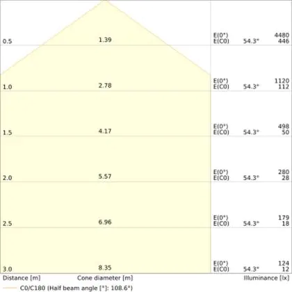 De gradenbundel geeft informatie over hoe breed het licht wordt uitgestraald. Dit zit tussen de 0 en 360 graden (D). Hoe kleiner de hoek, hoe specifieker de lichtbundel is. Over het algemeen is een smalle gradenbundel perfect voor sfeer- of accentverlichting, terwijl een brede gradenbundel ideaal is om grote oppervlaktes te verlichten.