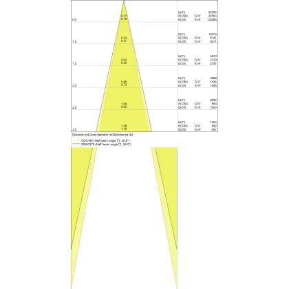 De gradenbundel geeft informatie over hoe breed het licht wordt uitgestraald. Dit zit tussen de 0 en 360 graden (D). Hoe kleiner de hoek, hoe specifieker de lichtbundel is. Over het algemeen is een smalle gradenbundel perfect voor sfeer- of accentverlichting, terwijl een brede gradenbundel ideaal is om grote oppervlaktes te verlichten.